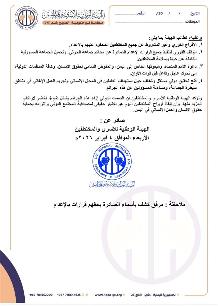 وطالبت الهيئة بالإفراج الفوري وغير المشروط عن جميع المختطفين المحكوم عليهم بالإعدام، والوقف الفوري لتنفيذ أحكام الإعدام، وتحميل الجماعة المسؤولية الكاملة عن حياة وسلامة المختطفين. داعيةً الأمم المتحدة ومبعوثها الخاص إلى اليمن والمفوض السامي لحقوق الإنسان وكافة المنظمات الدولية للتحرك العاجل قبل فوات الأوان، وفتح تحقيق دولي مستقل وشفاف بشأن استهداف العاملين في المجال الإنساني وتجريم العمل الإغاثي في مناطق سيطرة الجماعة ومساءلة المسؤولين.