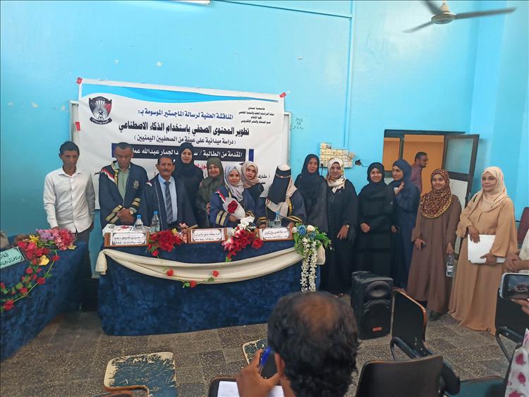 في تظاهرة أكاديمية نوعية واكبت لغة العصر ومستقبل المهنة، نالت الباحثة سماح عبد الجبار عبد الله عملاق، درجة الماجستير بتقدير (امتياز) من كلية الإعلام بجامعة عدن، عن رسالتها الموسومة بـ: "تطوير المحتوى الصحفي باستخدام الذكاء الاصطناعي: دراسة ميدانية على الصحفيين اليمنيين".