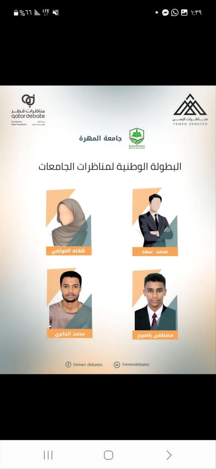 ومع تقدم المنافسات، واصل فريق الجامعة مسيرته بثبات، ليبلغ دوراً متقدماً بعد سلسلة من المناظرات القوية، قبل أن يخرج من الجولة الرابعة، وهذا إنجاز يعكس الحضور الفاعل لجامعة المهرة في الأنشطة الأكاديمية والطلابية والمهارية.