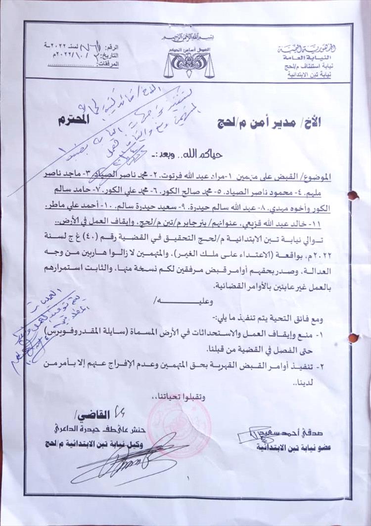 أصدر الشيخ عبدالعزيز العراقي إعلانًا تحذيريًا بشأن نزاع على أرض واقعة في منطقة المناصرة، حذّر فيه من التعامل مع شركة عدن الدولية المحدودة أو الدخول في أي معاملات مالية أو تعاقدية معها أو مع الأشخاص المرتبطين بها.