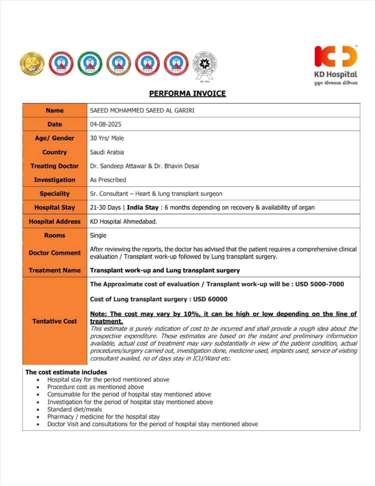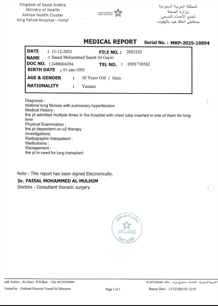 وأشارت التقارير الطبية إلى أن العلاج الوحيد لإنقاذ حياته يتمثل في إجراء عملية زراعة رئة في أحد المراكز الطبية المتخصصة في الهند، غير أن التكلفة المرتفعة للعملية والعلاج تفوق قدرة المريض وأسرته على تحملها.