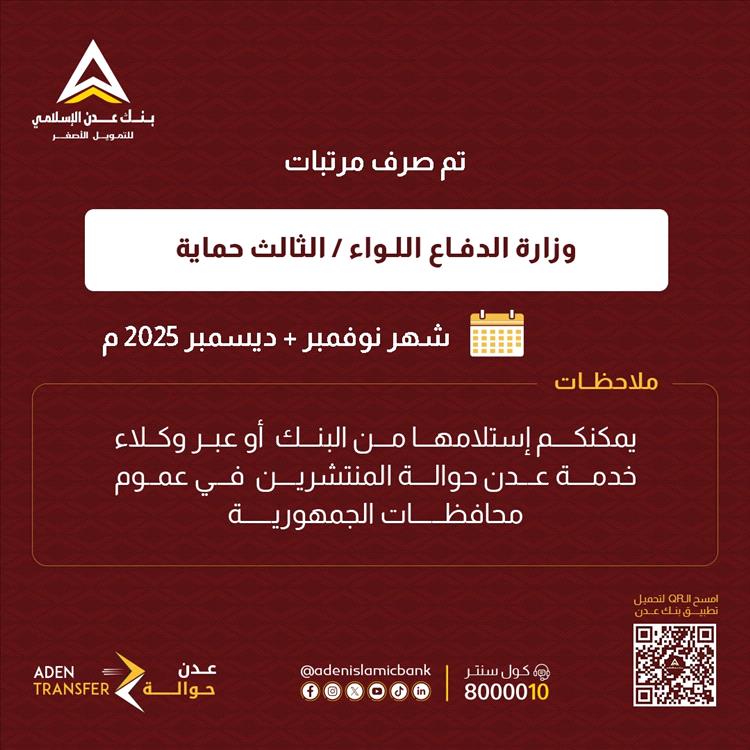 أعلن بنك عدن الإسلامي للتمويل الأصغر عن بدء صرف مرتبات عدد من الوحدات العسكرية التابعة لوزارة الدفاع عن شهري نوفمبر وديسمبر 2025.