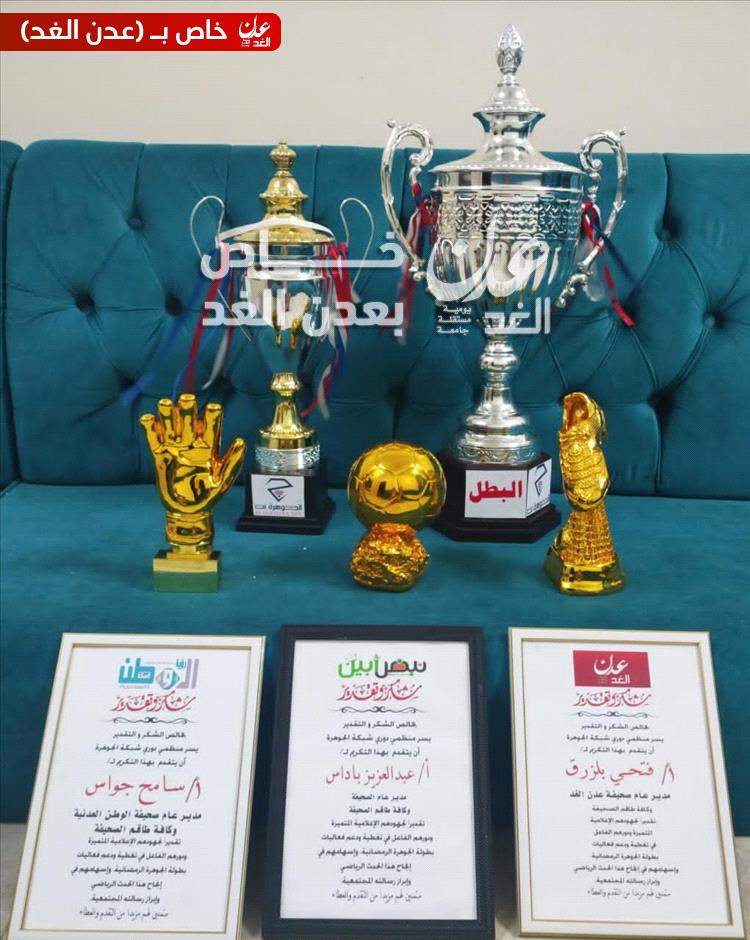 وفي ختام البطولة، تم توزيع الجوائز والكؤوس، إلى جانب تقديم شهادات تقديرية لكل من الأستاذ فتحي بن لزرق رئيس تحرير صحيفة عدن الغد، والأخ سامح جواس مدير عام صحيفة الوطن العدنية، والأخ عبدالعزيز باداس مدير عام صحيفة نبض أبين، تقديراً لدورهم في دعم التغطية الإعلامية ومواكبة أحداث البطولة.