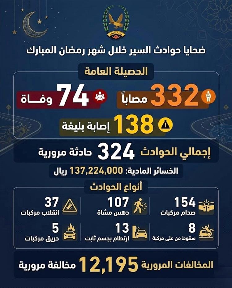 حصدت حوادث السير التي شهدتها المناطق والمحافظات المحررة خلال شهر رمضان المبارك حياة 74 شخصا، فيما أصيب جراءها 332 آخرين؛ وصفت إصابة 138 منهم بالبليغة، وبلغت خسائرها المادية 137 مليون و 224 ألف ريال.