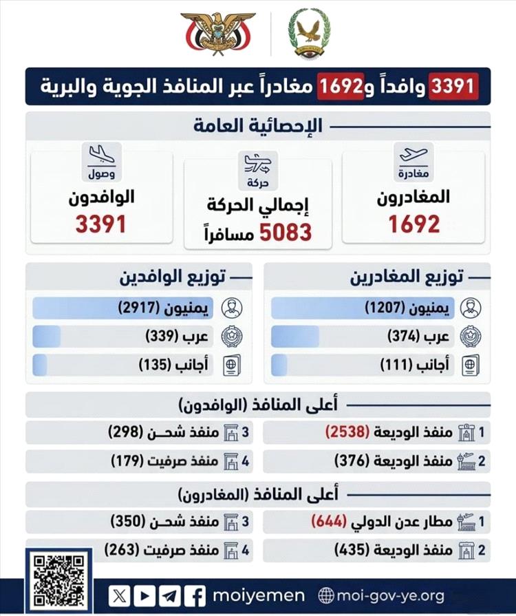 وفيما يتعلق بحركة المغادرين، تصدر مطار عدن الدولي القائمة بـ644 مغادراً، تلاه منفذ الوديعة بـ435 مغادراً، ثم منفذ شحن بـ350 مغادراً، ومنفذ صرفيت بـ263 مغادراً.
