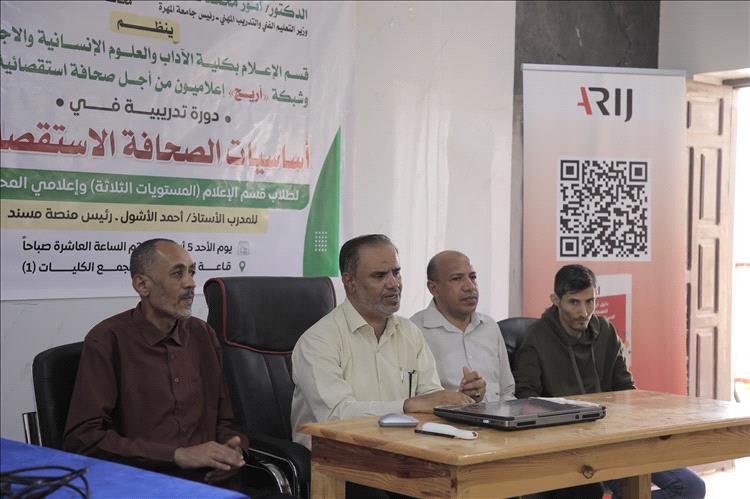 بدوره، أكد رئيس قسم الإعلام بكلية الآداب الدكتور عبدالله بخاش أن تنظيم هذه الدورة يأتي ضمن خطة القسم الرامية إلى تطوير مخرجاته التعليمية، ورفع كفاءة الطلاب في مجالات التحرير والتحقيق الصحفي، لافتاً إلى أن التعاون مع شبكة أريج يعزز من جودة التدريب ويمنح المشاركين خبرات مهنية متقدمة على أيدي مختصين في هذا المجال.