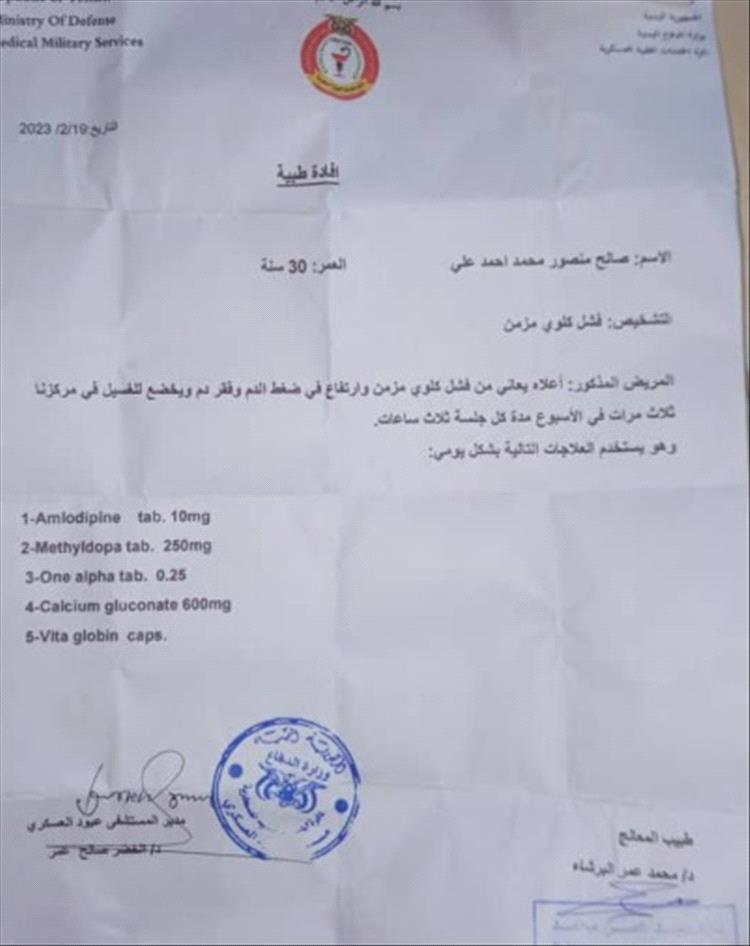 وقالت أسرة المريض، صالح منصور محمد أحمد علي، وهو أحد الحرس الشخصي للرئيس هادي، إن نجلها يعاني من مرض الفشل الكلوي ويخضع لعمليات غسيل ثلاث مرات أسبوعيًا.