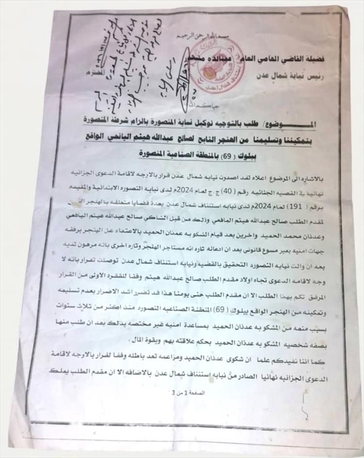 حضر إلى صحيفة "عدن الغد" التاجر عبدالله صالح عبدالله هيثم، شاكيًا تعرض هنجر تجاري تابع له في مديرية المنصورة، بلوك 69، أرضية رقم 45 خلف مصنع الشراب التابع للعيسائي، للبسط عليه.