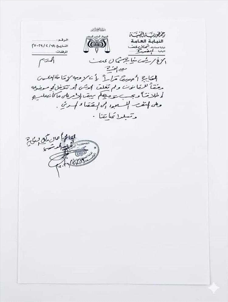 وطالب النائب العام ووزير الداخلية اللواء إبراهيم حيدان، ومحافظ عدن الأستاذ عبدالرحمن شيخ، بالتحرك العاجل وإنصافه.