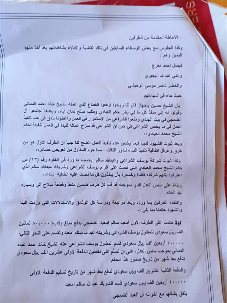 وتعود جذور القضية إلى نزاع مالي وقانوني نشب بين امعبد سالم امعبد الضمجي من جهة، والشيخ خالد أحمد عبده الدماني عن نفسه وعن يوسف الشراعي من جهة أخرى، على خلفية مقاولة بناء عمارة سكنية في قرية الرقُب بمديرية لودر. وتعاقبت على القضية إجراءات وأحكام متعددة خلال السنوات الماضية، إلا أنها لم تفضِ إلى حل جذري، بل زادت المشهد تعقيدًا ووسعت فجوة القطيعة.