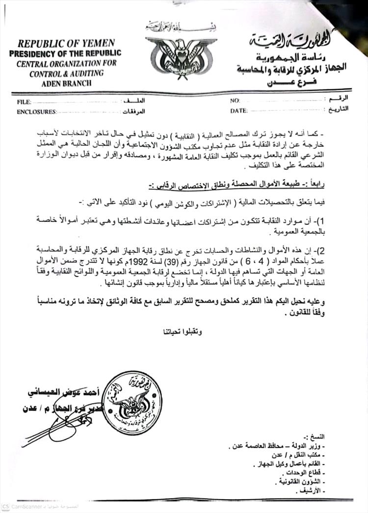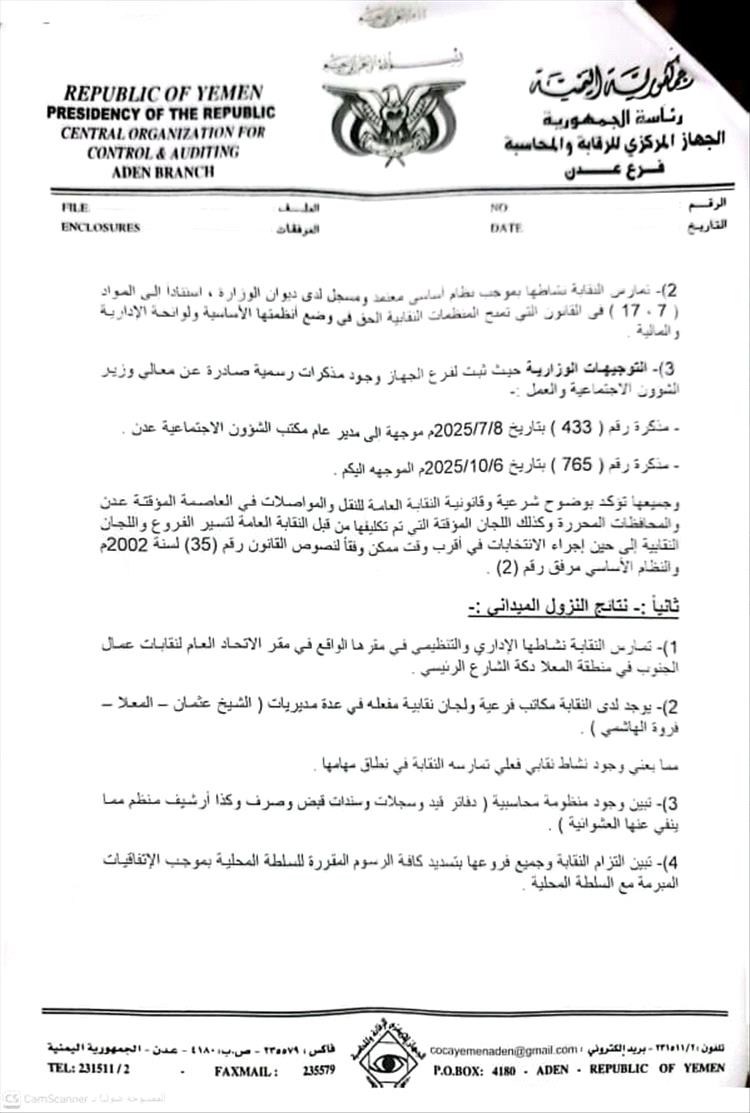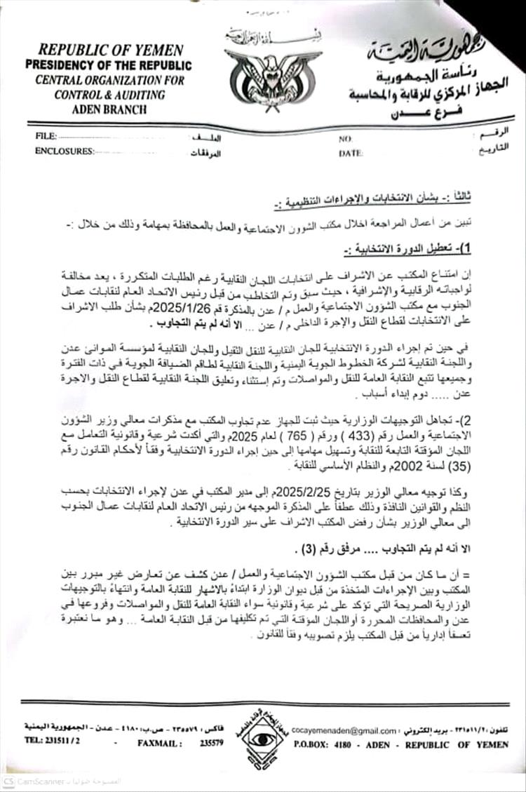 وفي ما يتعلق بالانتخابات النقابية، لفت المصدر إلى أن التقرير أشار إلى وجود قصور في أداء مكتب الشؤون الاجتماعية والعمل بعدن، نتيجة عدم الإشراف على العملية الانتخابية رغم التوجيهات والطلبات المتكررة، وهو ما أدى إلى استمرار عمل اللجان المؤقتة بشكل قانوني.