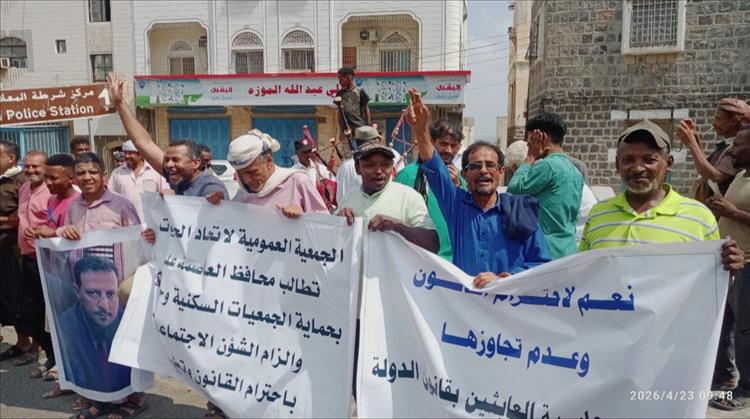 شهدت محافظة عدن، صباح الخميس، وقفة احتجاجية نظمتها اللجنة التحضيرية للاتحاد العام للجمعيات التعاونية السكنية أمام مبنى المحافظة، للمطالبة بإقالة مدير عام مكتب الشؤون الاجتماعية والعمل، على خلفية ما وصفته بتجاوزات قانونية وتدخلات غير مشروعة في شؤون الاتحاد.