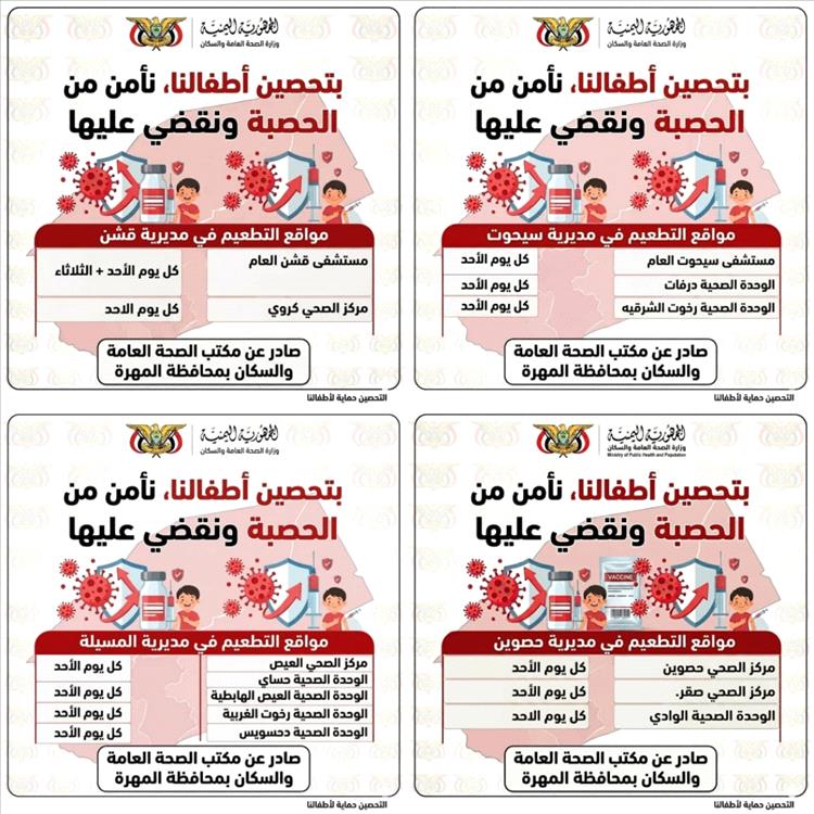 في إطار الجهود الصحية الرامية للحد من انتشار الأمراض المعدية، أعلنت الجهات المختصة عن توفير مواقع ومراكز للتطعيم ضد مرض الحصبة في مختلف مديريات محافظة المهرة، داعيةً أولياء الأمور إلى الاستفادة من هذه الخدمات الصحية المجانية.