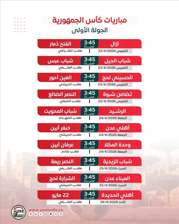 هذا وقد شهد اليوم الأول من البطولة إقامة 4 مباريات على أربعة ملاعب مختلفة واقعة في 4 محافظات يمنية، وتتواصل مباريات الجولة الأولى من بطولة كأس الجمهورية عصر غدا الجمعة بإقامة 3 مباريات على ثلاثة ملاعب مختلفة في ثلاث محافظات عدن، حضرموت وتعز.