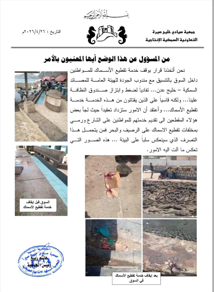 وقالت الجمعية في بيان صادر عنها إن مندوب الهيئة العامة للمصائد السمكية بخليج عدن، وبالتعاون مع صندوق النظافة، أوقف خدمة التقطيع التي كانت تقدم للمواطنين داخل السوق، مشيرة إلى أن القرار انعكس سلبًا على البيئة والنظافة العامة.