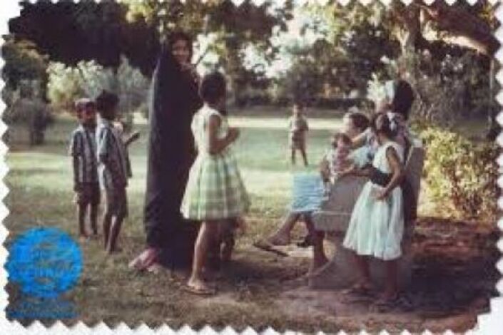 الصورة من الإرشيف القديم لأم انجليزية مع أطفالها مع أخرى عدنية مع أطفالها يتنزهون في حديقة الكمسري ((الملاهي)) في مدينة الشيخ عثمان.